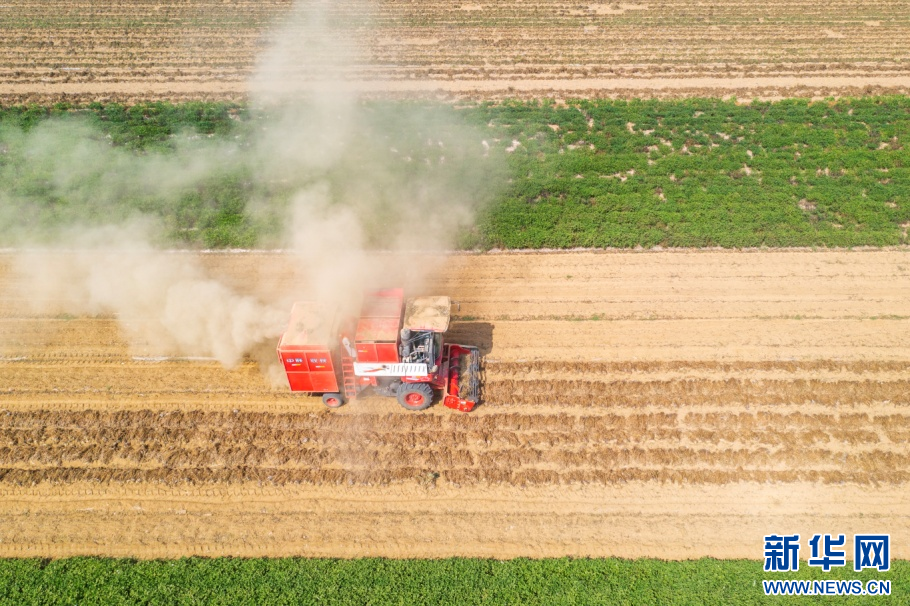 在日照市莒县夏庄镇,联合收割机正收获花生。新华网发(陈光金 摄)