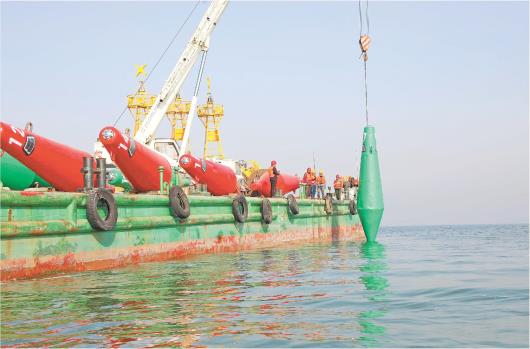 近日,渤海湾海域,山东滨港海洋工程装备公司的技术人员为业主更换航道冬季浮标,投放智能一体化钢制冬季浮标。据悉,此次是我国北方海域航道首次用上智能一体化钢制冬季浮标。