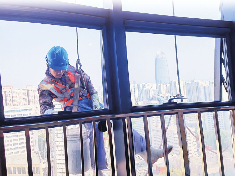“感觉累了,就抬头望望远处的‘山东第一高楼’,有种一览众山小的感觉。”张哥说,高空作业虽有风险但薪资可观,“养活一家老小没问题”。