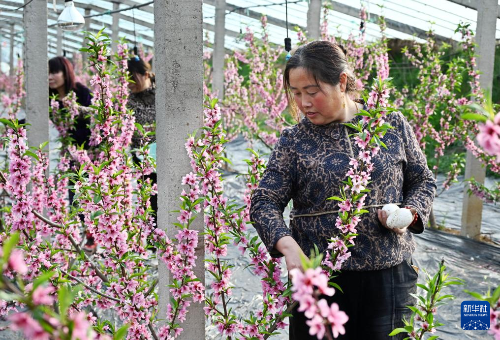 2月28日,平度市白沙河街道大孙戈庄村村民在油桃生态大棚内捡拾鹅蛋。