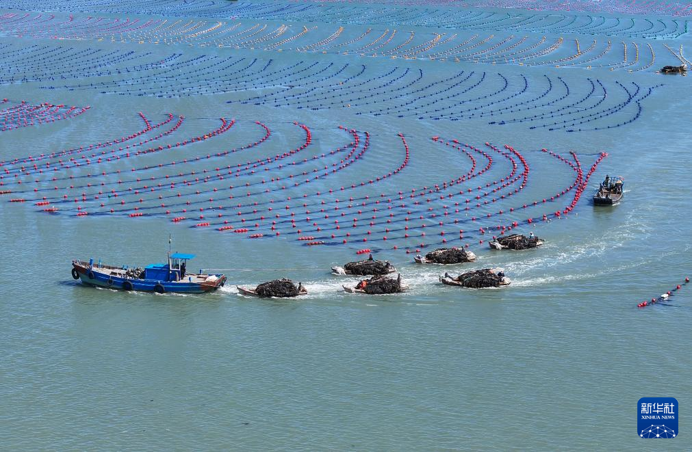 5月12日,在山东省荣成市爱伦湾海域,养殖工人驾驶满载海带的舢板驶回码头(无人机照片)。