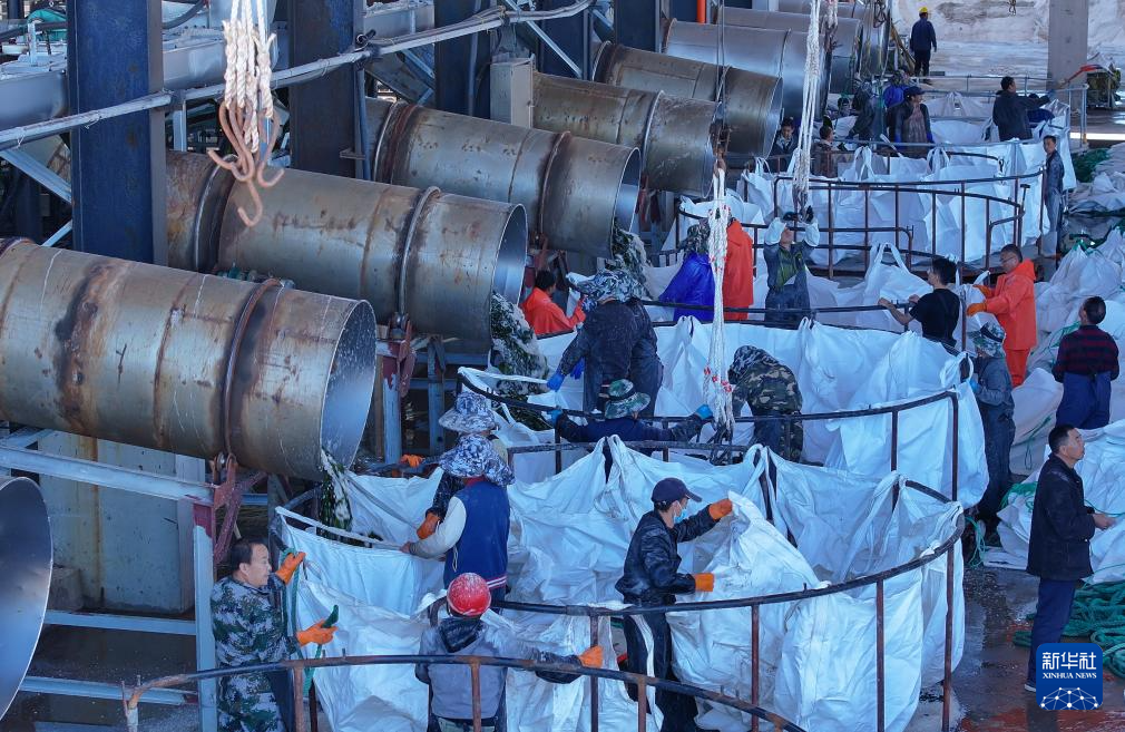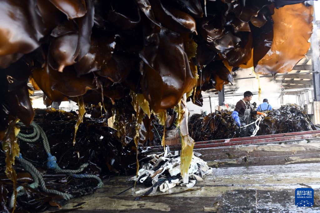 眼下,正值山东省荣成市海带采收、加工旺季,荣成市爱伦湾沿岸的盐渍海带加工区一派忙碌景象。