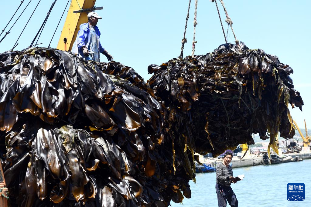 5月12日,在山东省荣成市爱伦湾码头,工人将收获的海带装车。