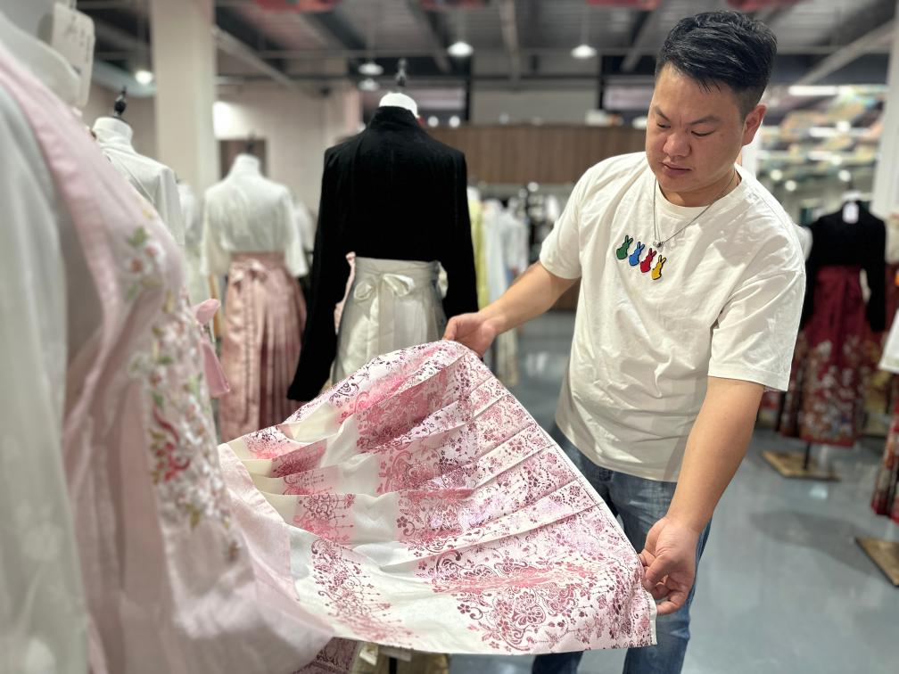 新品上市好不好,消费者的“购买键”不会说谎。在有爱云仓汉服基地的展厅里,一件清新淡雅的长裙吸引了记者的注意。“这也是今夏的新品之一,但一经上市供不应求,至今都没来得及起名。”曹县有爱云仓汉服基地负责人李字雷介绍说,这款长裙使用了仿醋酸面料制作,对比传统马面裙,没有褶、更轻薄,垂坠感更强,适合全年龄段的女性消费者日常穿着。汉服爱好者胡馨月说:“我在夏天喜欢穿面料轻薄、浅色的马面裙,这款长裙既清凉还好看。”