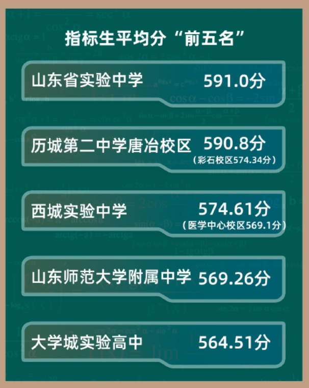 今年面向市区招生的高中学校指标生平均分“前五名”分别为:山东省实验中学591.0分;历城第二中学唐冶校区590.8分(彩石校区574.34分);西城实验中学574.61分(医学中心校区569.1分);山东师范大学附属中学569.26分;大学城实验高中564.51分。