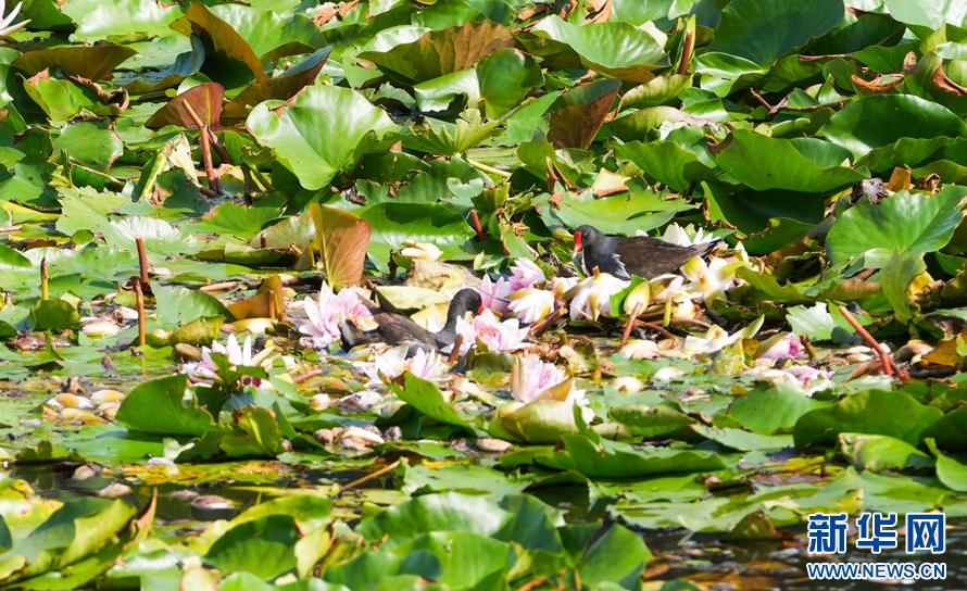 荷塘建成后,吸引许多水鸟在此觅食筑巢(无人机照片)。新华网发(董乃德 摄)