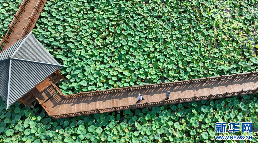 莲叶田田,行人依依,栈桥、凉亭、荷塘,构成乡村美景(无人机照片)。新华网发(董乃德 摄)