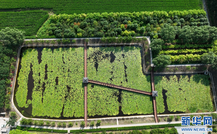建成后的荷塘被绿树环绕(无人机照片)。新华网发(董乃德 摄)
