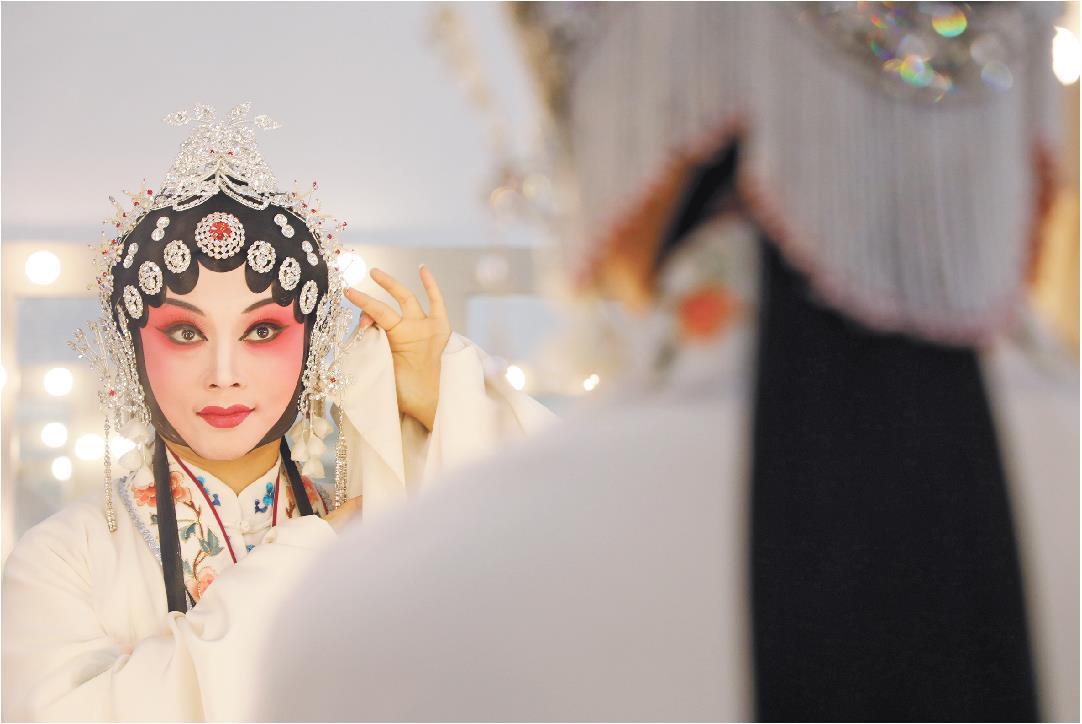 图为8月27日,戏曲演员在后台整理妆容,准备登台表演。