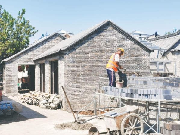 9月3日,在济南西更道街北首,1号院和南侧相邻院落的原有居民自建房拆除后,施工人员在原址新建了青砖灰瓦的仿古建筑,并将对老门楼进行改建。据了解,这处院落是清末著名小说家刘鹗的名作《老残游记》中写到的“高升店”,也是刘鹗曾经居住过的地方。按照济南古城(明府城片区)城市更新项目的规划,作为一处重要节点,该项目占地面积1273平方米,计划将原有泉渠打通改造,使其成为一处景观融入改造后的仿古院落,再现老济南家家泉水、青砖黛瓦的历史风貌。(本报记者 崔健 摄)