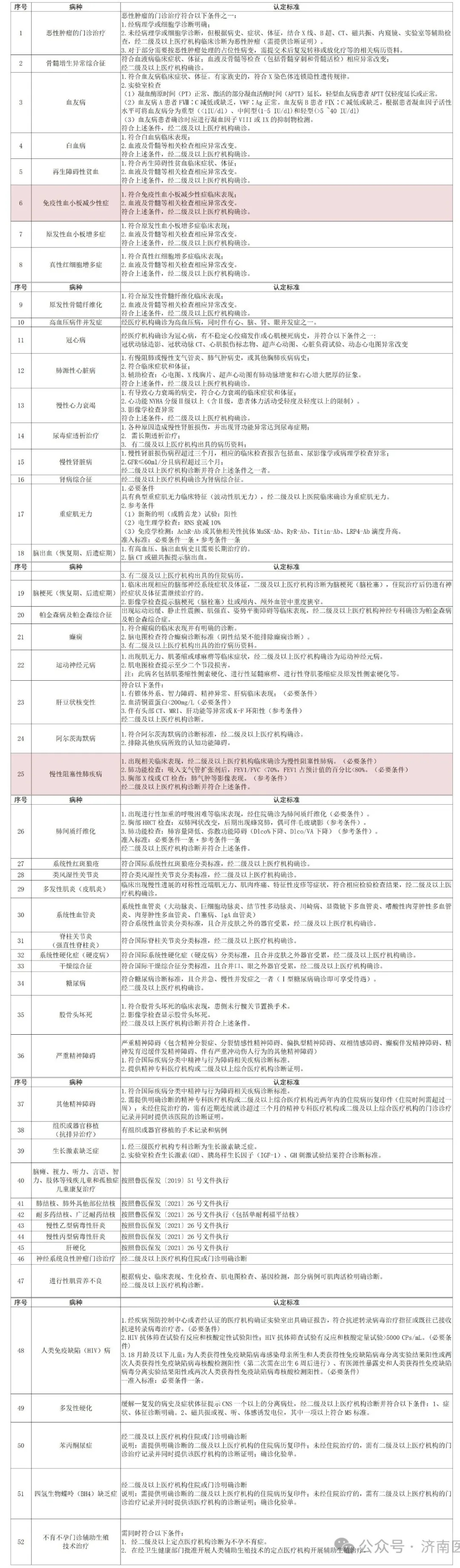 原济南市门诊慢特病基本病种中的“免疫性血小板减少性紫癜”调整为“免疫性血小板减少症”,认定标准调整为:符合免疫性血小板减少症临床表现、血液及骨髓等相关检查相应异常改变,经二级及以上医疗机构确诊;原“慢性阻塞性肺疾病”认定医院级别调整为二级及以上医疗机构。