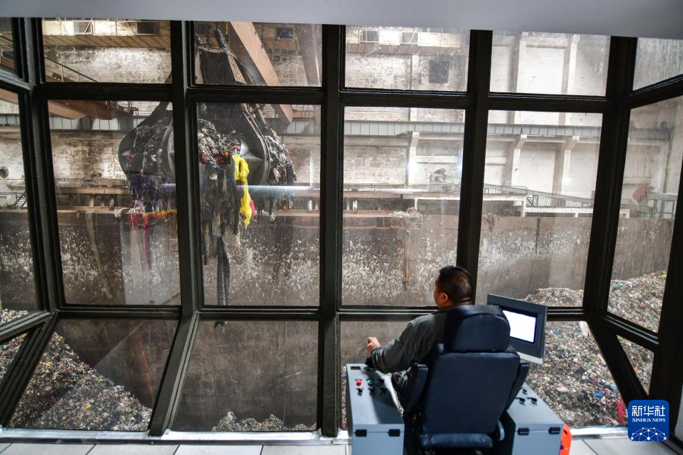 9月19日,在山东启迪济能环保科技有限公司,工作人员在控制室内操作设备吊运垃圾。新华社记者 朱峥 摄