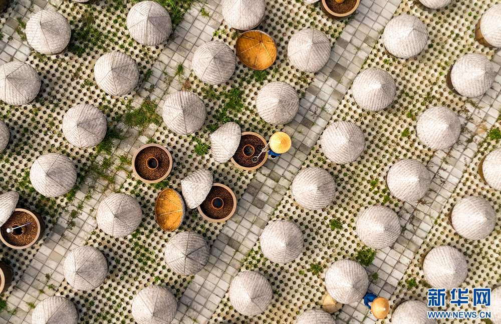 晾晒场上,酱缸里的酱油正接受“日光浴”。新华网发(张进刚 摄)