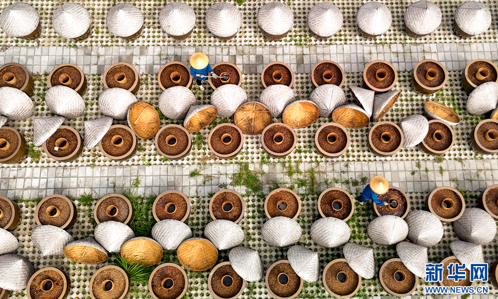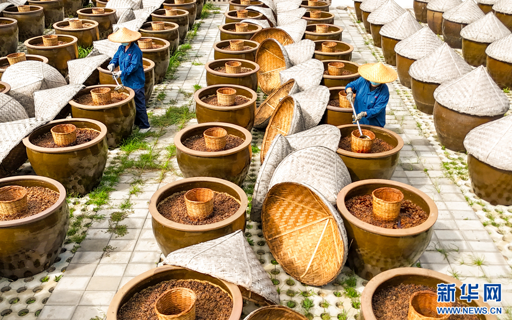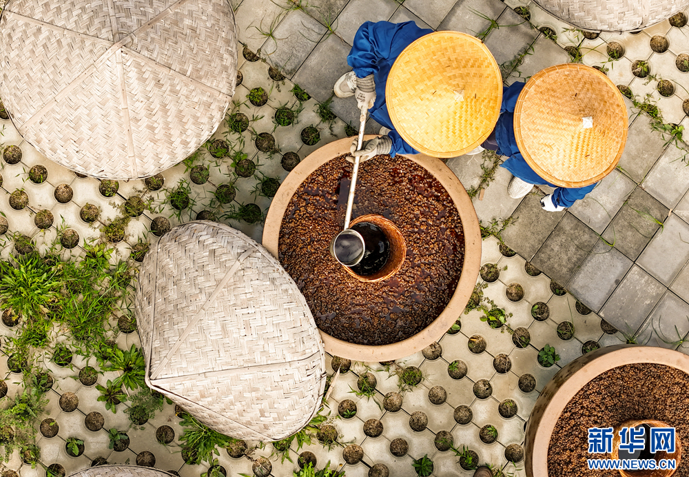 工人们利用晴好天气酿晒酱油,让大缸里的酱料充分发酵。新华网发(张进刚 摄)
