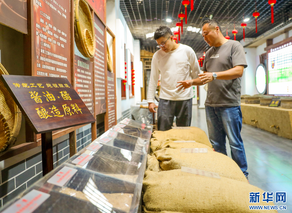 市民在山东省滕州市一家酱醋食品有限公司的酱园文化馆了解生产工艺。新华网发(张进刚 摄)