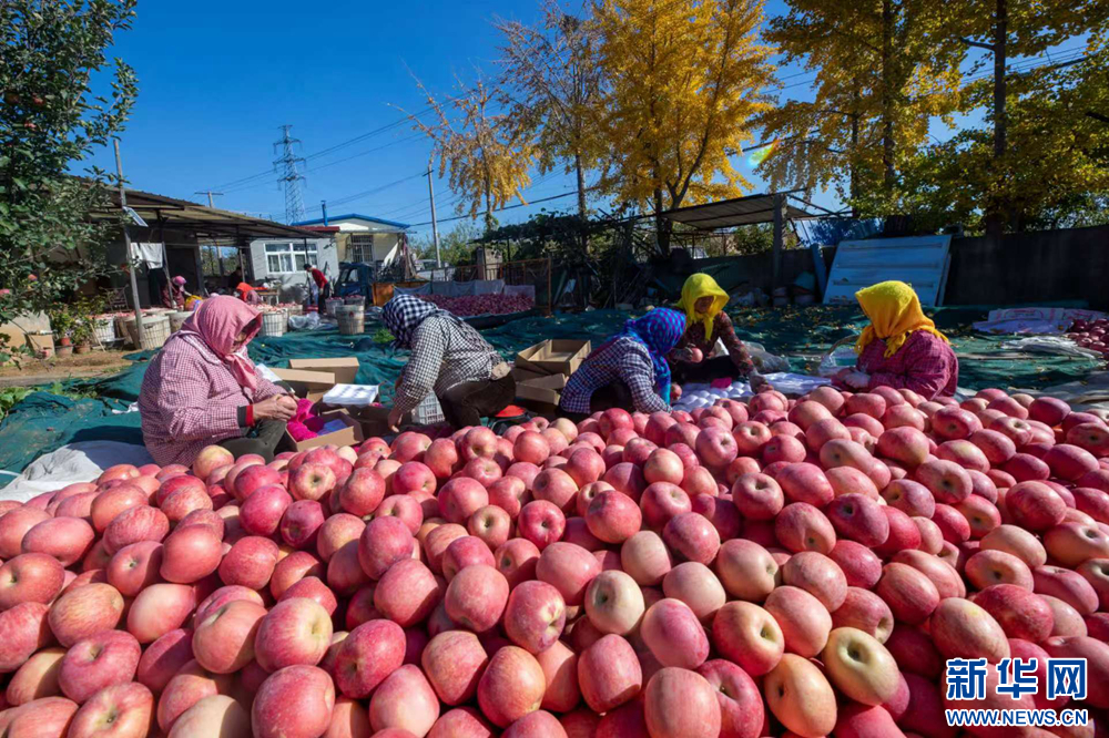 进入深秋,山东省烟台市福山区东厅街道北侯旨沟村苹果园里,红彤彤的苹果挂满枝头,果农们穿梭其间采摘、转运、装车,分享着丰收的喜悦和劳动的果实。