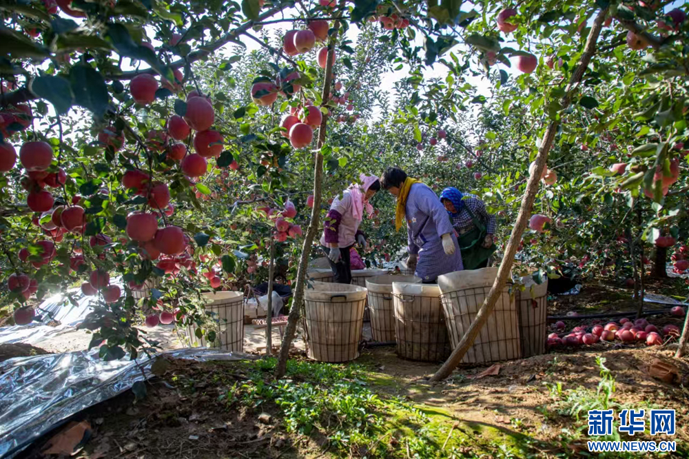 村民们穿梭在果园中采摘、转运。新华网发 (刘卫芳 摄)
