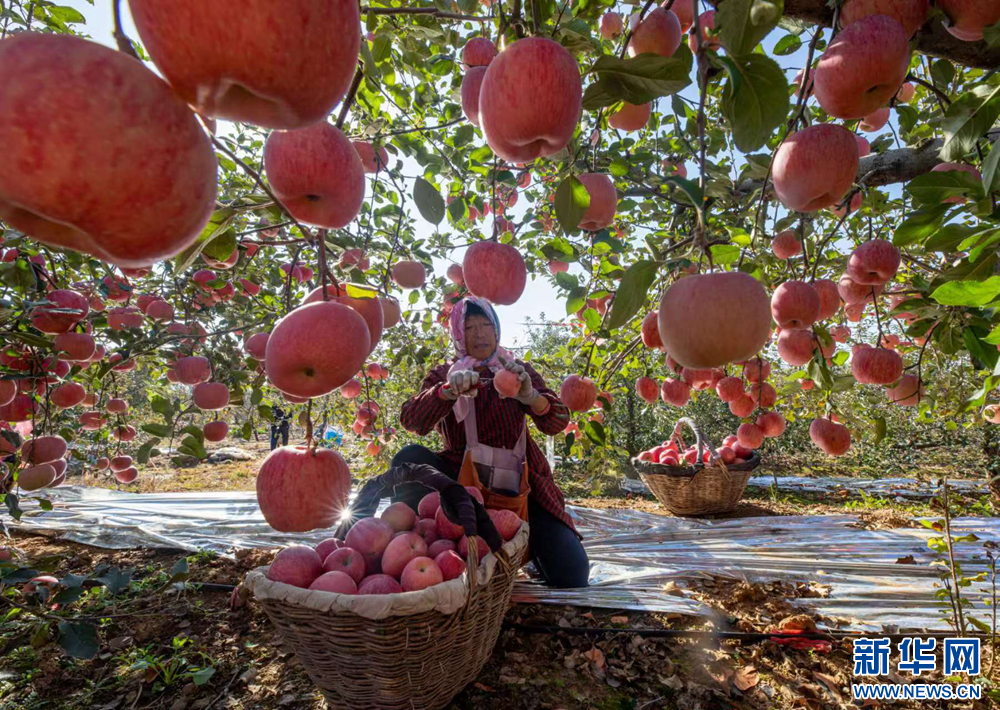 北侯旨沟村村民正在采摘苹果,脸上洋溢着丰收的喜悦。新华网发 (刘卫芳 摄)