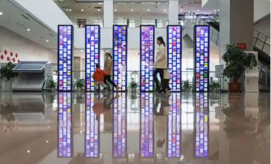 一楼电子屏幕以瀑布流滚动形式展示各类图书。