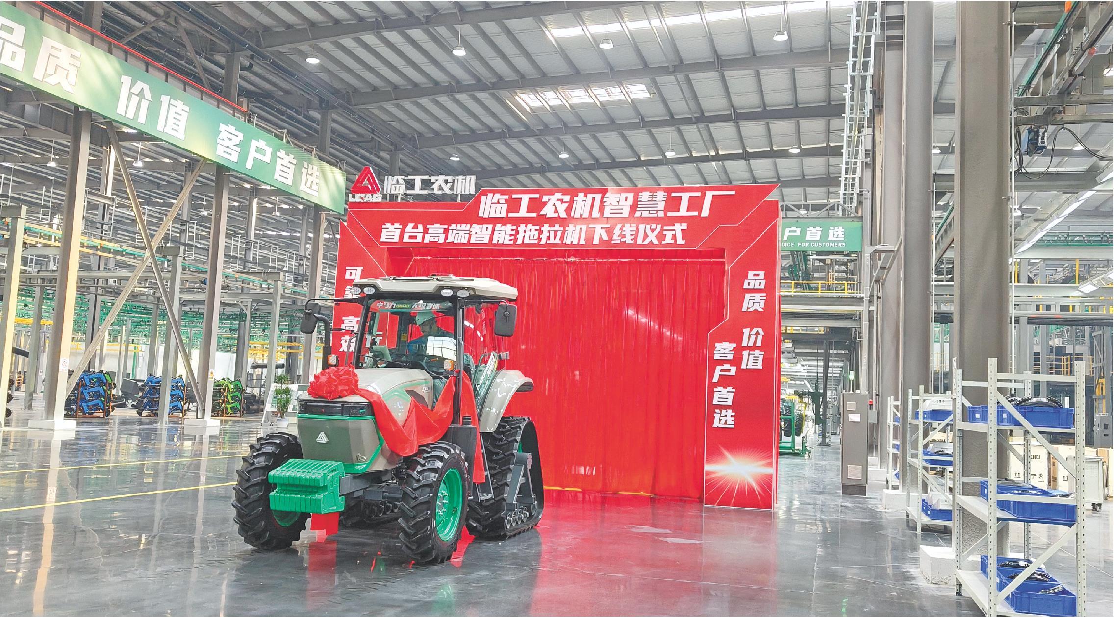 图为临工农机智慧工厂生产的首台高端智能拖拉机下线。