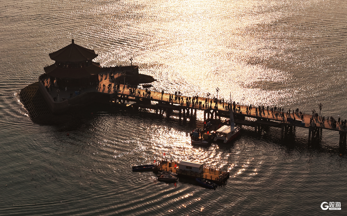 冬日暖阳下的栈桥,海水碧蓝,游人如织。