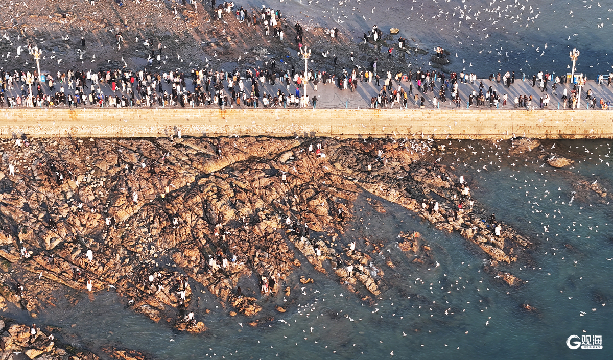 冬日的青岛栈桥海滨有一种独属于青岛的浪漫气质,金色的夕阳与飞翔的海鸥构成了青岛湾畔一幅和谐动人的画卷。数万只海鸥翔集,从空中俯瞰,宛如碧玉盘上镶嵌的一粒粒白色珍珠,吸引众多游客前来观赏喂食,人鸥和谐相处,成为冬日青岛一道独特的旅游风景。(青岛日报社/观海新闻记者 樊蓉)