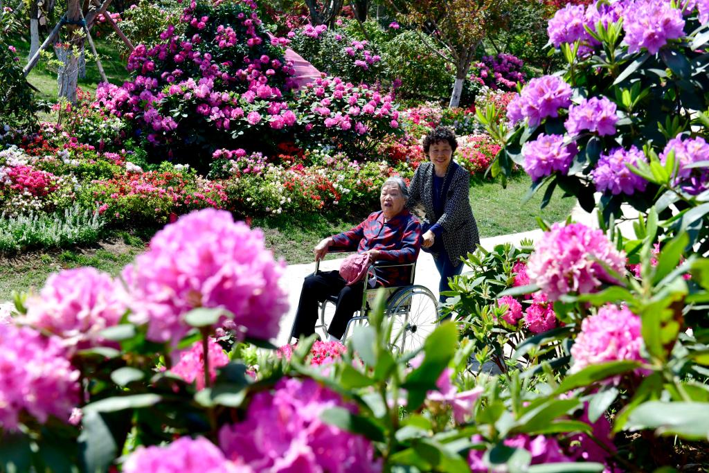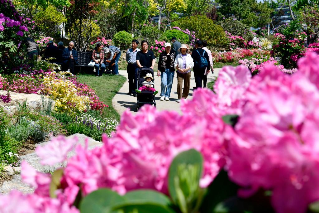 眼下,在山东日照山海天旅游度假区中国杜鹃花博览园,杜鹃花竞相开放,吸引了众多游客游园赏花。新华社记者 郭绪雷 摄