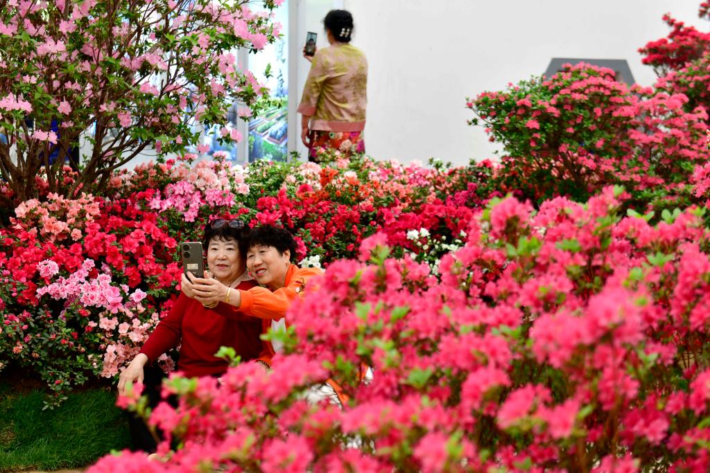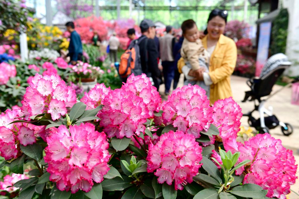 4月28日,在中国杜鹃花博览园,游客在赏花拍照。