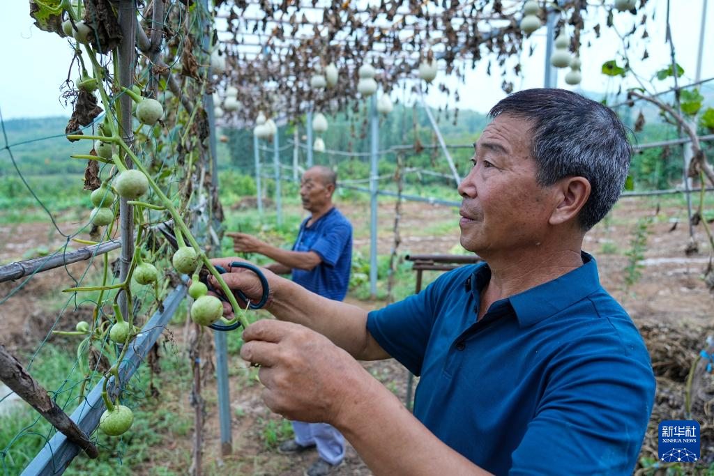 9月16日,村民在肥城市老城街道张家花峪村打理观赏葫芦。2022年,这个村创办肥城市七姑娘顶生态农业专业合作社,引导村民栽植葫芦3000余株,发展葫芦种植特色产业。