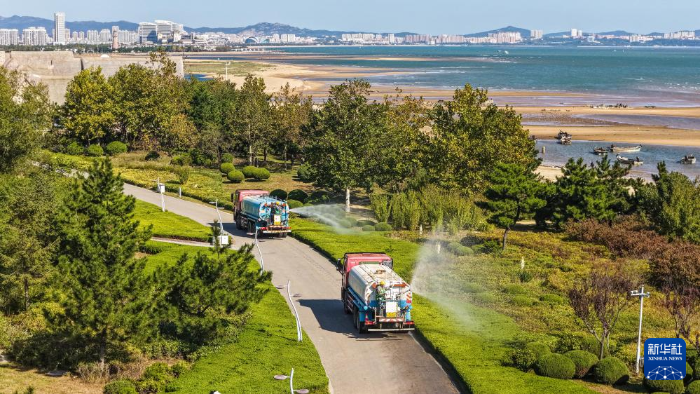10月23日,在山东威海桑沟湾,工作人员为绿化带浇水(无人机照片)。