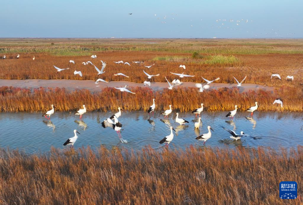 10月21日,东方白鹳、白琵鹭在山东东营黄河口湾区湿地栖息、觅食(无人机照片)。