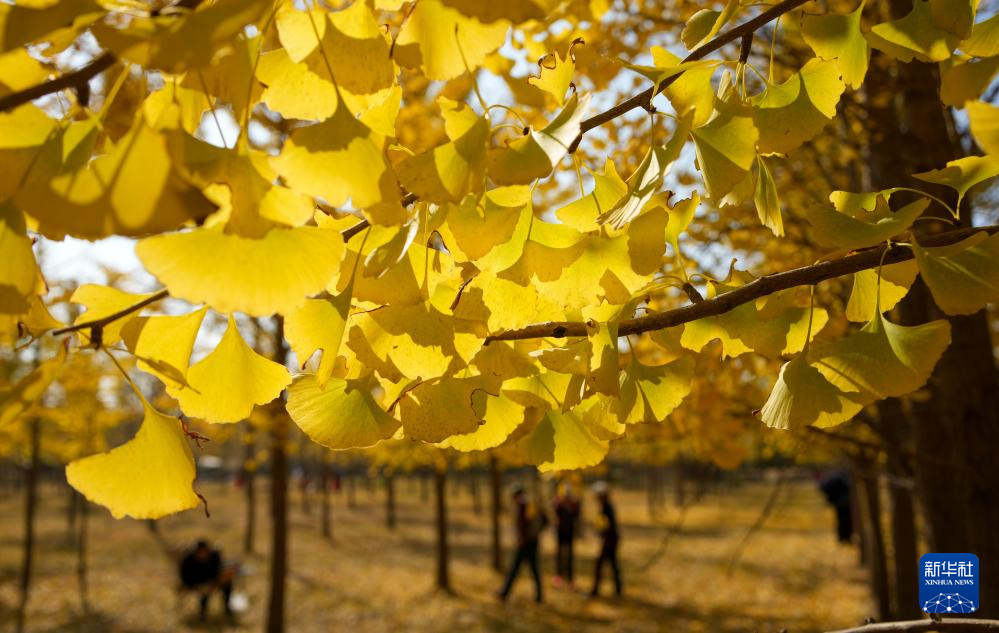 10月29日,人们在济南市槐荫区的一片银杏林里游览。新华社记者 徐速绘 摄