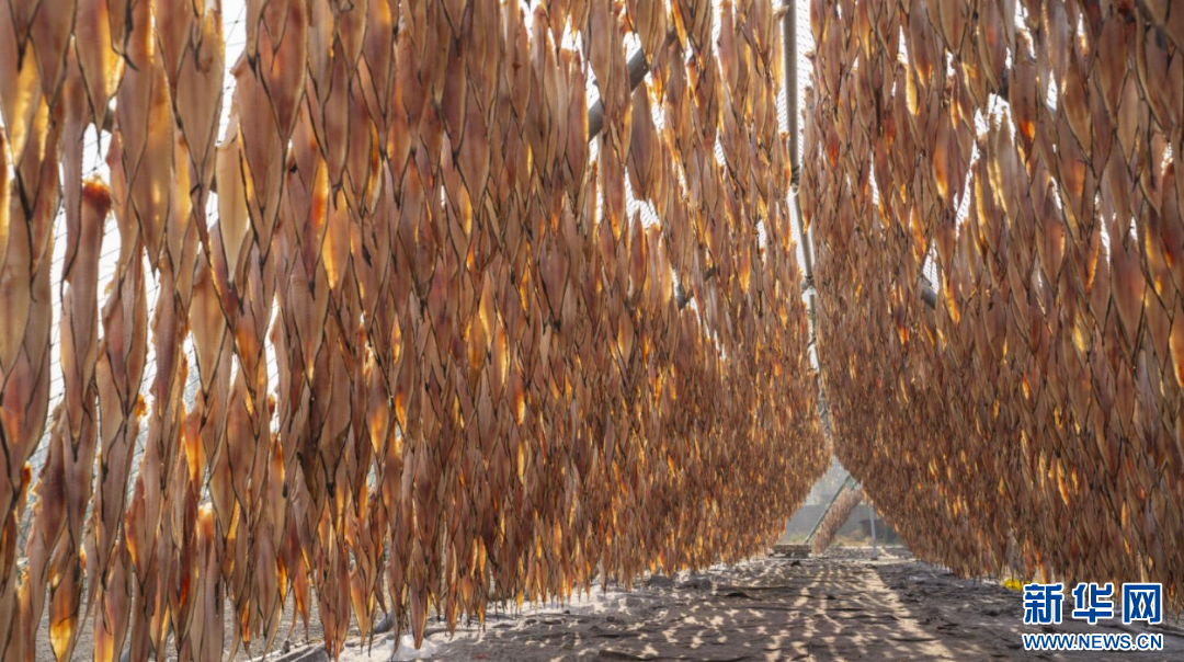 在日照市岚山区安东卫街道,鱼干批量晾晒。新华网发(林坤 摄)