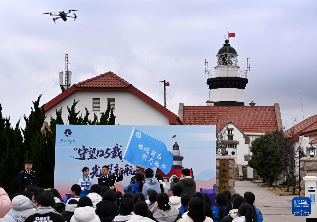 12月10日,团岛灯塔灯塔长胡中石在纪念仪式上挥舞象征灯塔精神传承的旗帜。新华社记者李紫恒摄