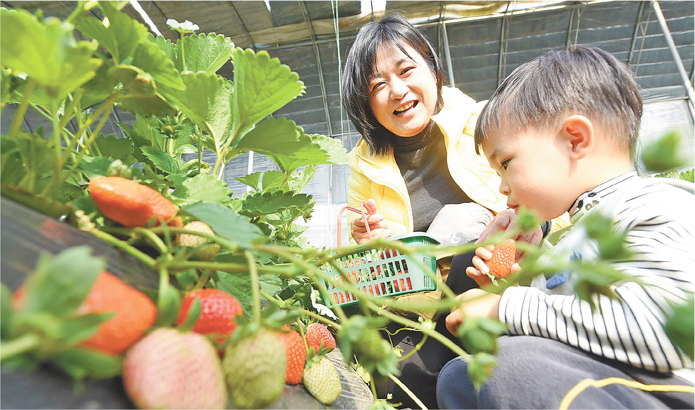 进入寒冬,随着大棚草莓大面积成熟,元旦假期也迎来采摘热。1月1日,在阳谷县侨润街道东唐村特色园区佳美草莓大棚里,游客带着孩子正在采摘草莓。