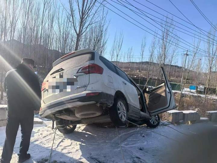1月21日8时许,济南历城公安分局彩石派出所接到紧急报警,市民贾先生驾驶车辆行至玉龙村桥时,因降雪导致路面湿滑,刹车不及,车辆受惯性影响冲出桥面,悬于一侧崖头边缘,一旦下车或车辆晃动极有可能坠下,情况危急。