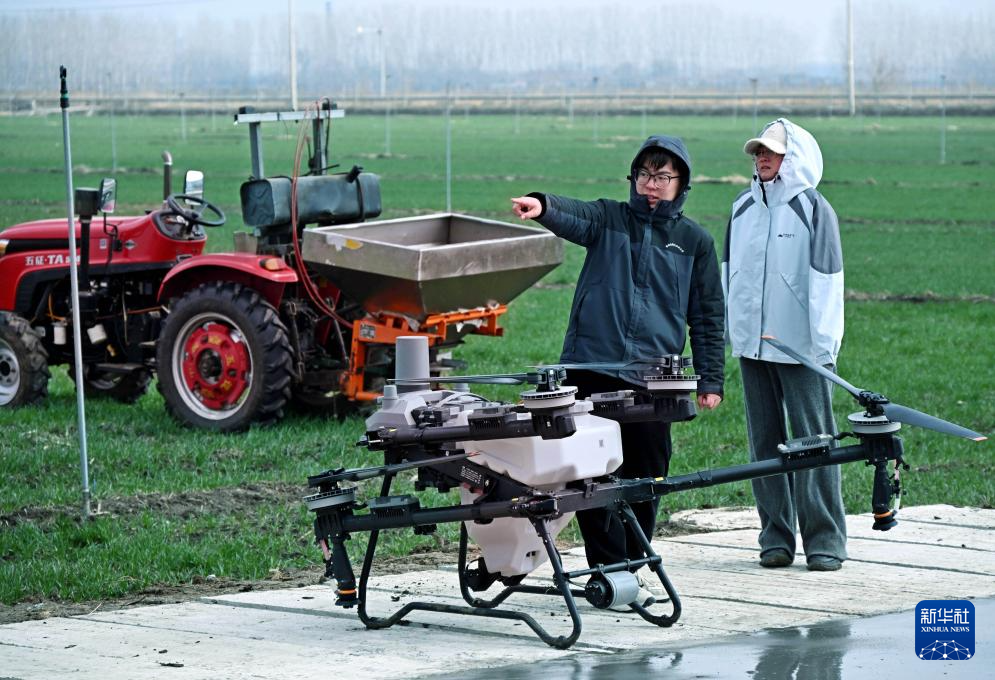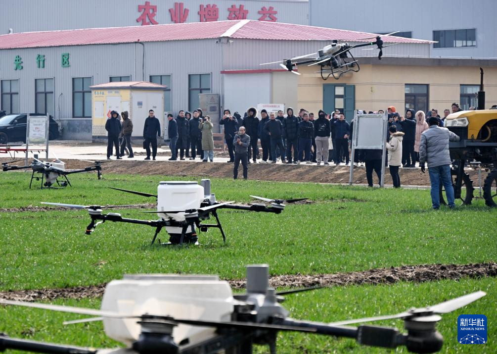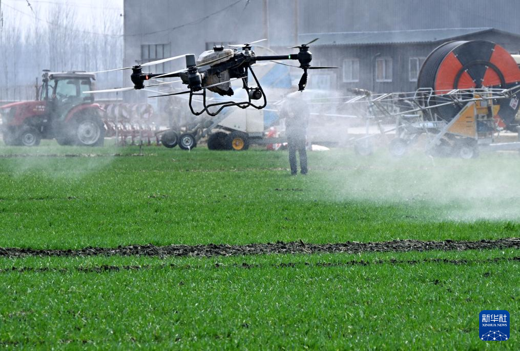 3月6日,在青岛市即墨区蓝村街道壮武村,植保无人机进行喷防演示。新华社记者 李紫恒 摄
