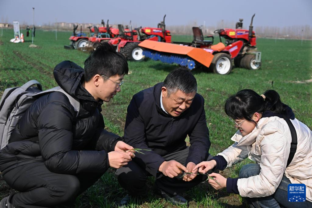 3月6日,在青岛市即墨区蓝村街道壮武村,青岛市种粮大户姜永战(中)查看小麦生长状况。新华社记者 李紫恒 摄