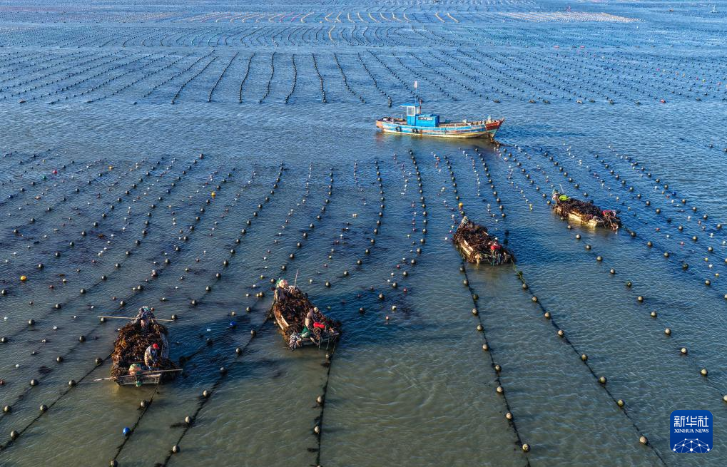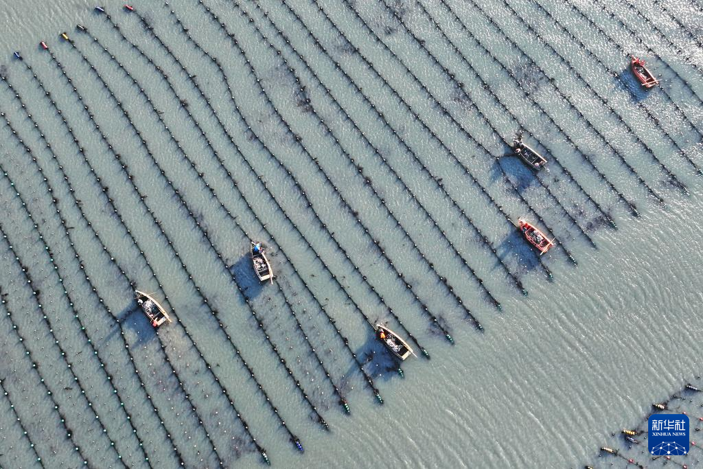 3月9日,在山东省荣成市爱伦湾海洋牧场海带养殖区,养殖工人收获海带(无人机照片)。新华社发(王福东摄)