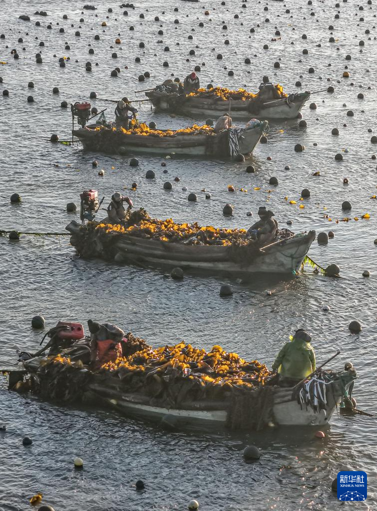 眼下,在我国海带主产区山东省荣成市,海洋牧场海带养殖区一派繁忙景象。养殖户对近岸养殖区达到成熟标准的海带分批收割,为后期收割的海带留出生长空间,以便提高海带产量和质量。