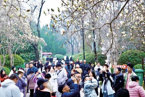 百花公园玉兰大道作为济南最具人气的赏花地之一,吸引了大量市民拍照打卡。